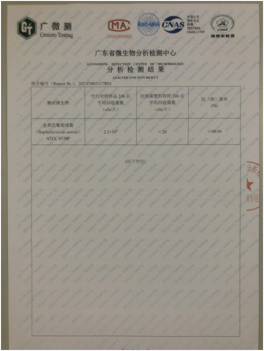 圖2是委托具備CMA、CNAS等資質(zhì)的廣東省微生物分析檢測(cè)中心檢測(cè),依據(jù)JC/T939-2004標(biāo)準(zhǔn)測(cè)試其抗菌性能得到的測(cè)試結(jié)果。測(cè)試結(jié)果表明,經(jīng)24小時(shí)后,抗細(xì)菌塑料管樣抗菌率達(dá)到99.99%以上,說(shuō)明我們的抗菌水管具備優(yōu)良的抗細(xì)菌性能。